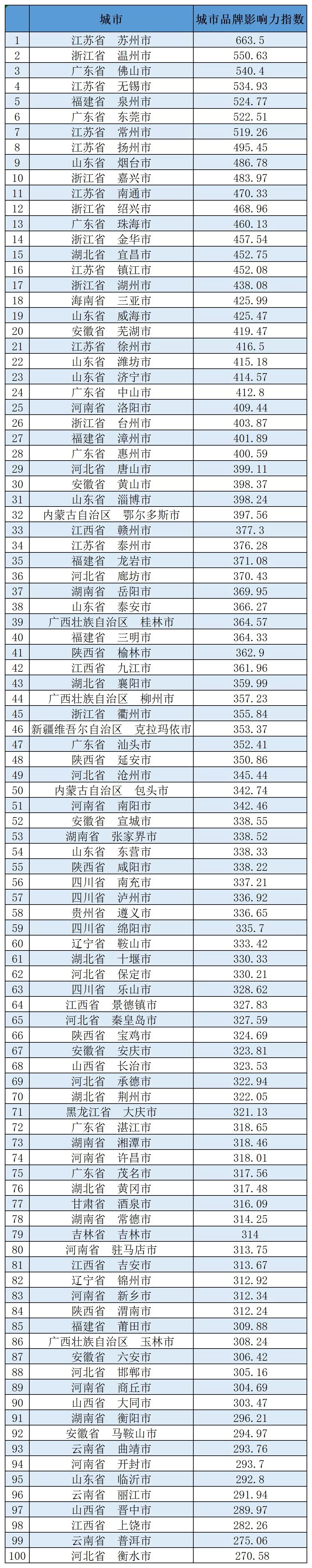 城市品牌是一个城市生态形象、文化形象、经济形象、政府形象的客观展示,城市品牌的评价有利于城市竞争力的提升和人民生活质量的提高。中国百强品牌城市榜单