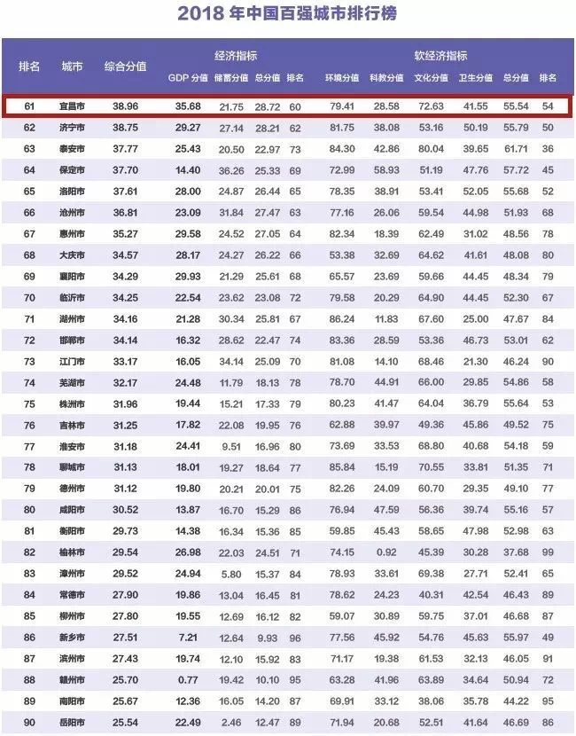 在代表城市未来发展潜力上宜昌位列中国城市竞争力排行榜第40位