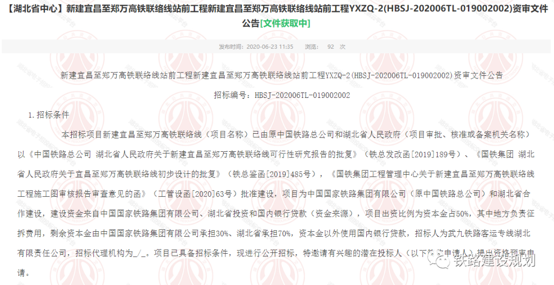 6月23日,《新建宜昌至郑万高铁联络线站前工程资审文件公告》正式发布。标志着宜昌至郑万高铁联络线工程即将进入正式施工阶段。