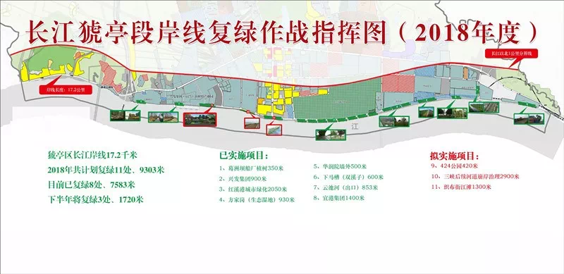 持续实施长江猇亭段岸线复绿,今年猇亭区制定了作战指挥图:实施11个项目,复绿岸线9303米。
