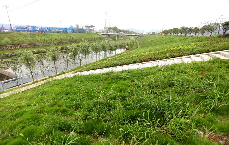 两岸阶梯式绿化带绿意盎然。