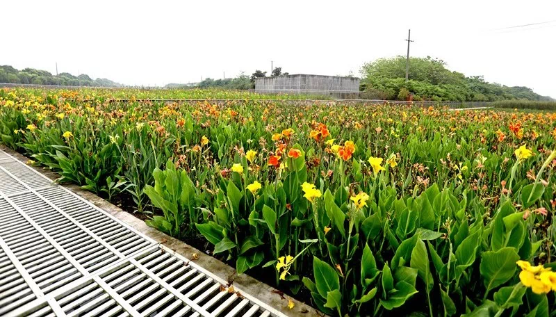 猇亭区污水处理厂对面,生态湿地公园内美人蕉竞相开放,引来众多游人驻足观赏。