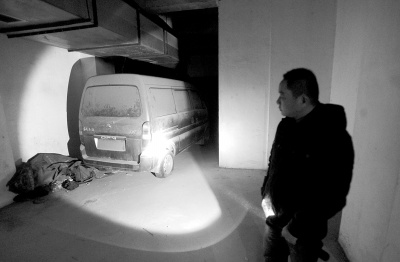 在小区地下车库一角,停放着两辆面包车和一辆白色老式桑塔纳轿车。3辆车车身都满是灰尘,破旧不堪,两辆面包车的车门都没关,车厢内已经拉起了蛛网。