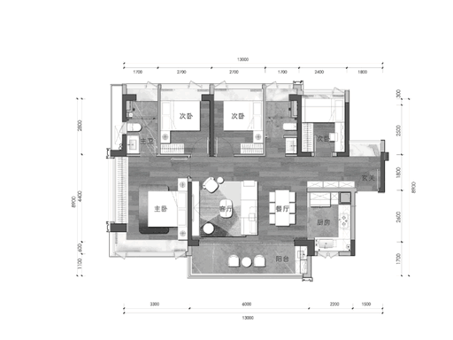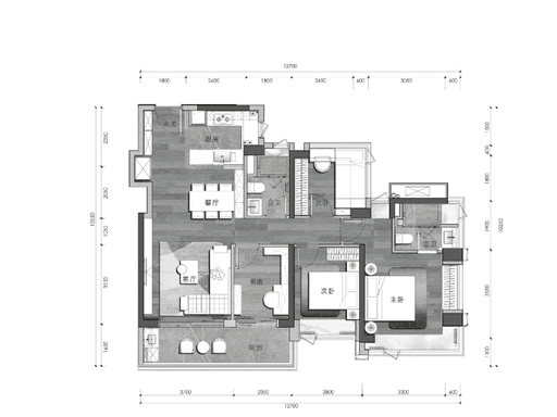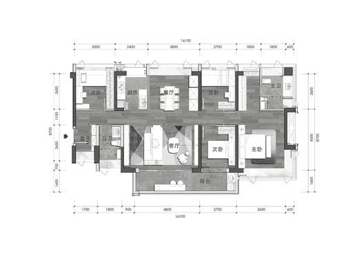 空间布局:横厅格局打破传统空间限制,客厅、餐厅、阳台连成一线,空间感极强,彰显居住格调;南向主卧套房,配备独立卫浴、步入式衣帽间,私密性与舒适度兼具。